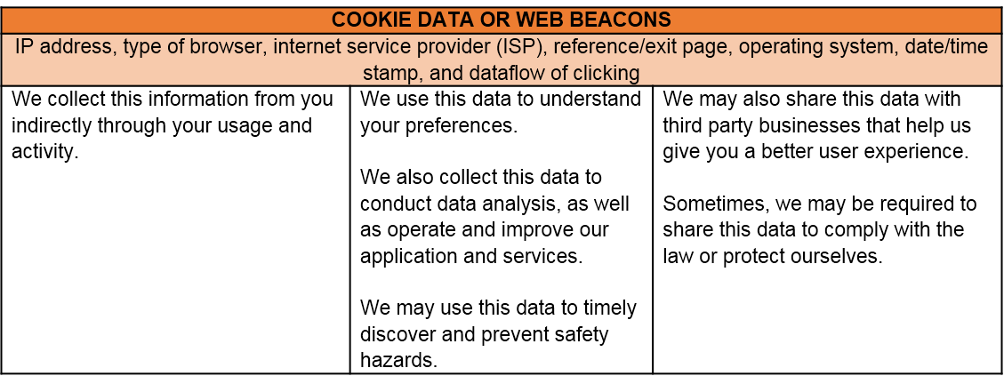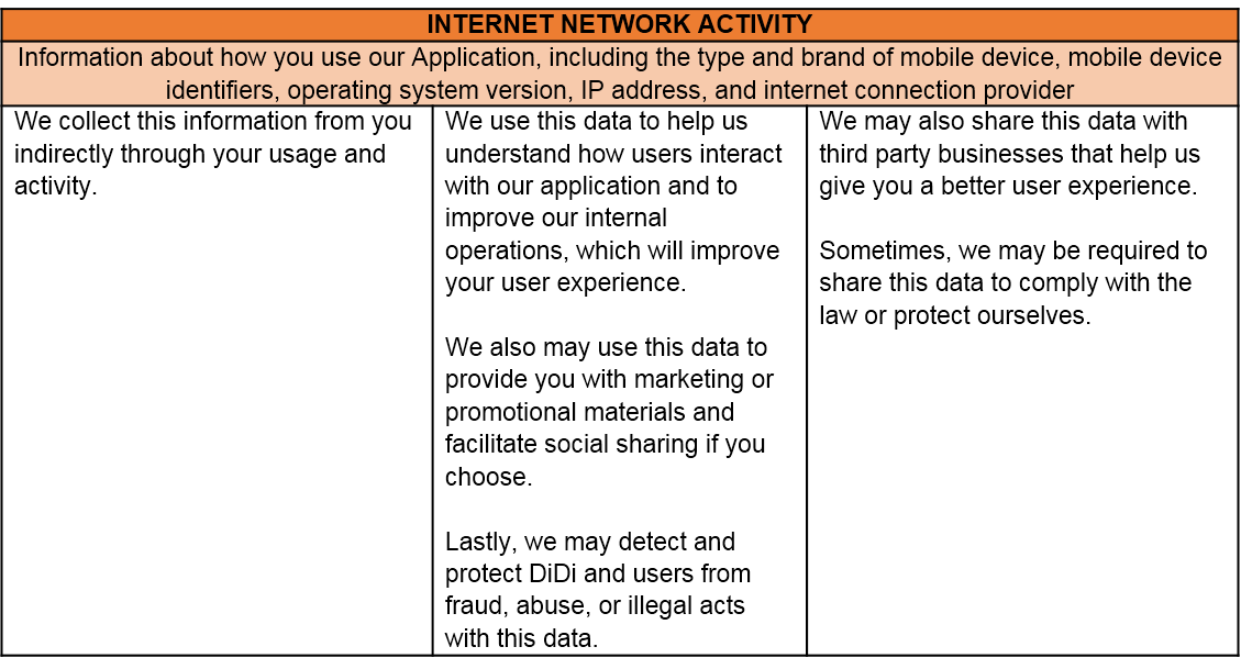 DiDi collects activity data for internal operational improvement and quality purposes. DiDi’s technology does not recognize “Do Not Track” browser signals because doing so would interfere with the functionality of our application.