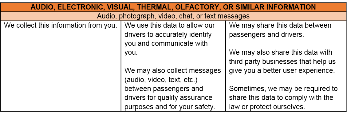 The table below describes the categories of Personal Information we may collect, along with how we use and when we may share each category of Personal Information. We will not use the Personal Information for materially different purposes without notifying you.