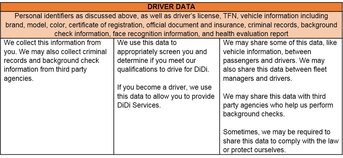 This Policy applies to the driver users (users who provide transportation services as an individual), the passengers users (users who request or receive transportation services), and users of other categories (such as the fleet managers) (collectively “users” or “you”) who are residents in the United States or Canada. In addition to this Policy, we will provide separate notification in certain functions of DiDi Services that require us to use your personal information.
